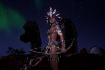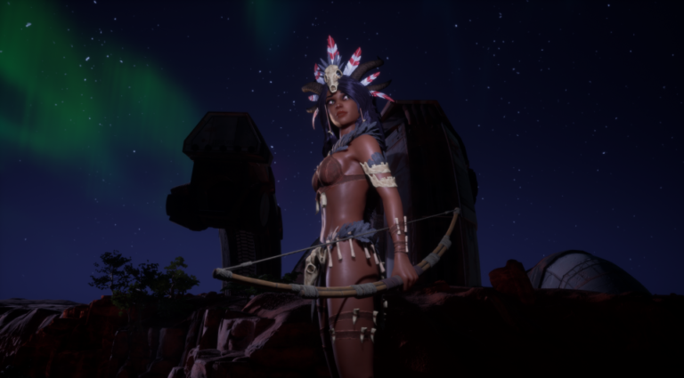 Maya brown supermodel with Native American head-dress – bikini-top – bow-for-arrow – night aurora – club Trail of Tits – HighresScreenshot00038