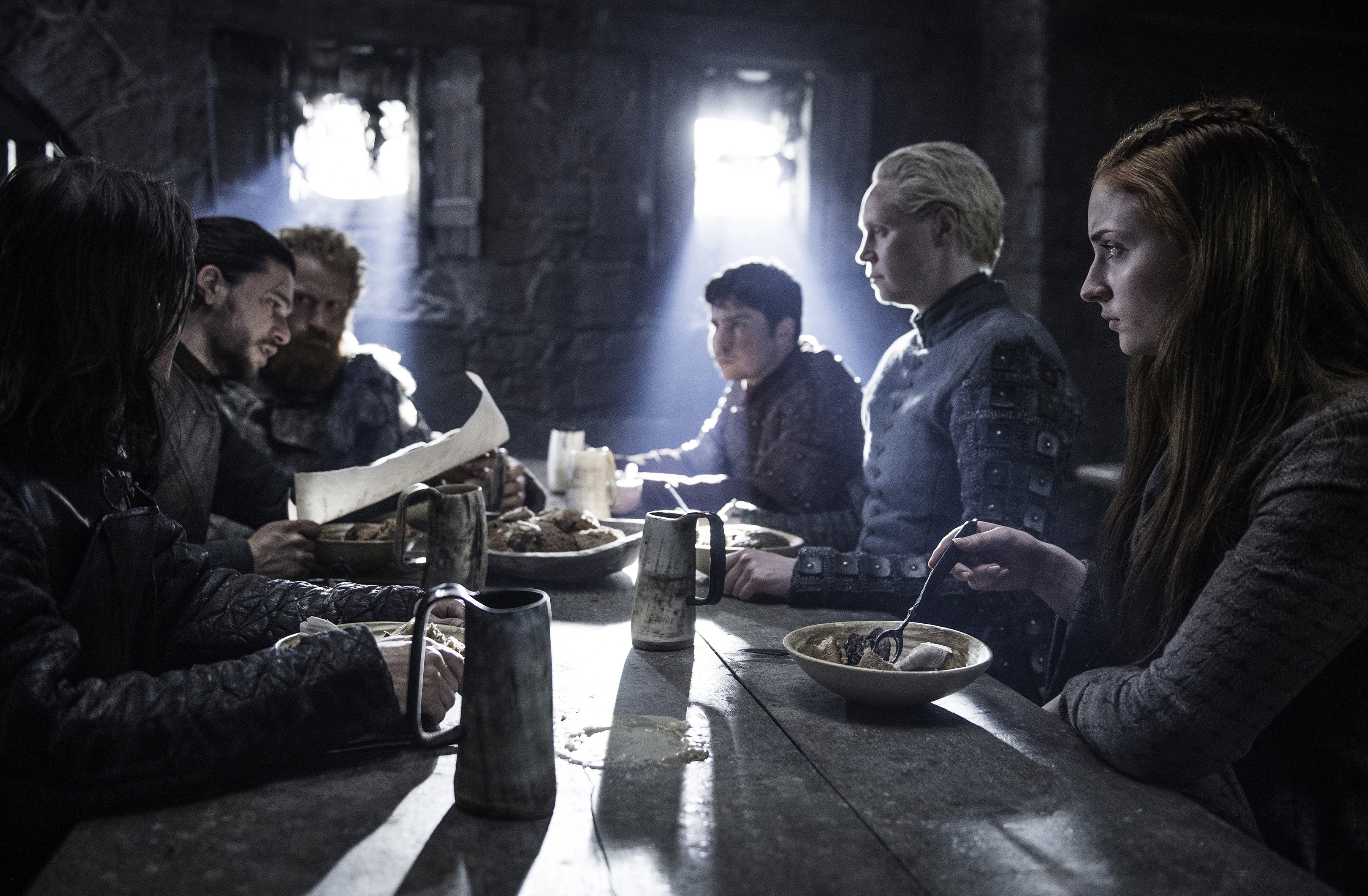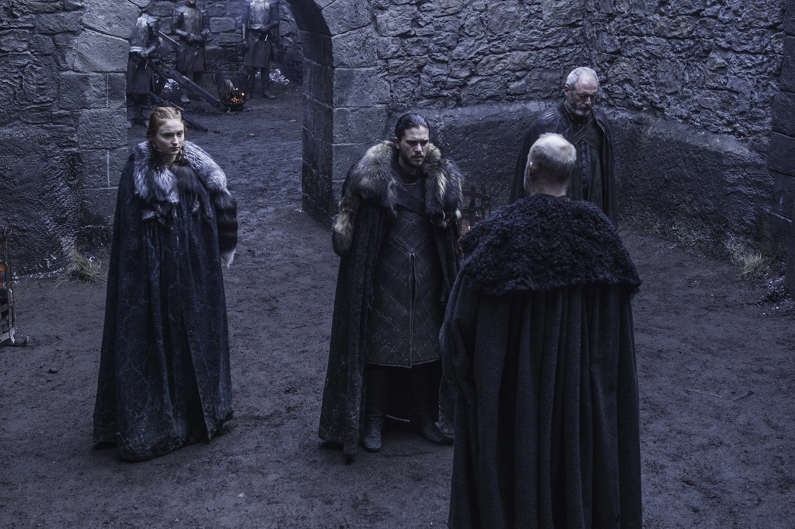 Sansa, Jon, and Davos review a message from Tyrion Lannister in which Tyrion asks for Jon to meet with Daenerys Targaryen on Dragonstone. Sansa questions the letter’s legitimacy, worried that it was forged to lure Jon into a trap. Fortunately, he confirms the letter is genuine after reading a familiar line from his first meeting with Tyrion. Jon asks Sansa for her opinion. Sansa responds that Tyrion was not like the other Lannisters and he was kind to her. She still affirms that leaving for Dragonstone could possibly put her half-brother in danger, despite Tyrion’s letter saying that Daenerys’s faction only wishes to forge an alliance against Cersei, albeit also detailing the military forces that Daenerys has at her disposal. After examining the letter for himself, Davos says that three dragons would prove indispensable in their battle against the White Walkers.