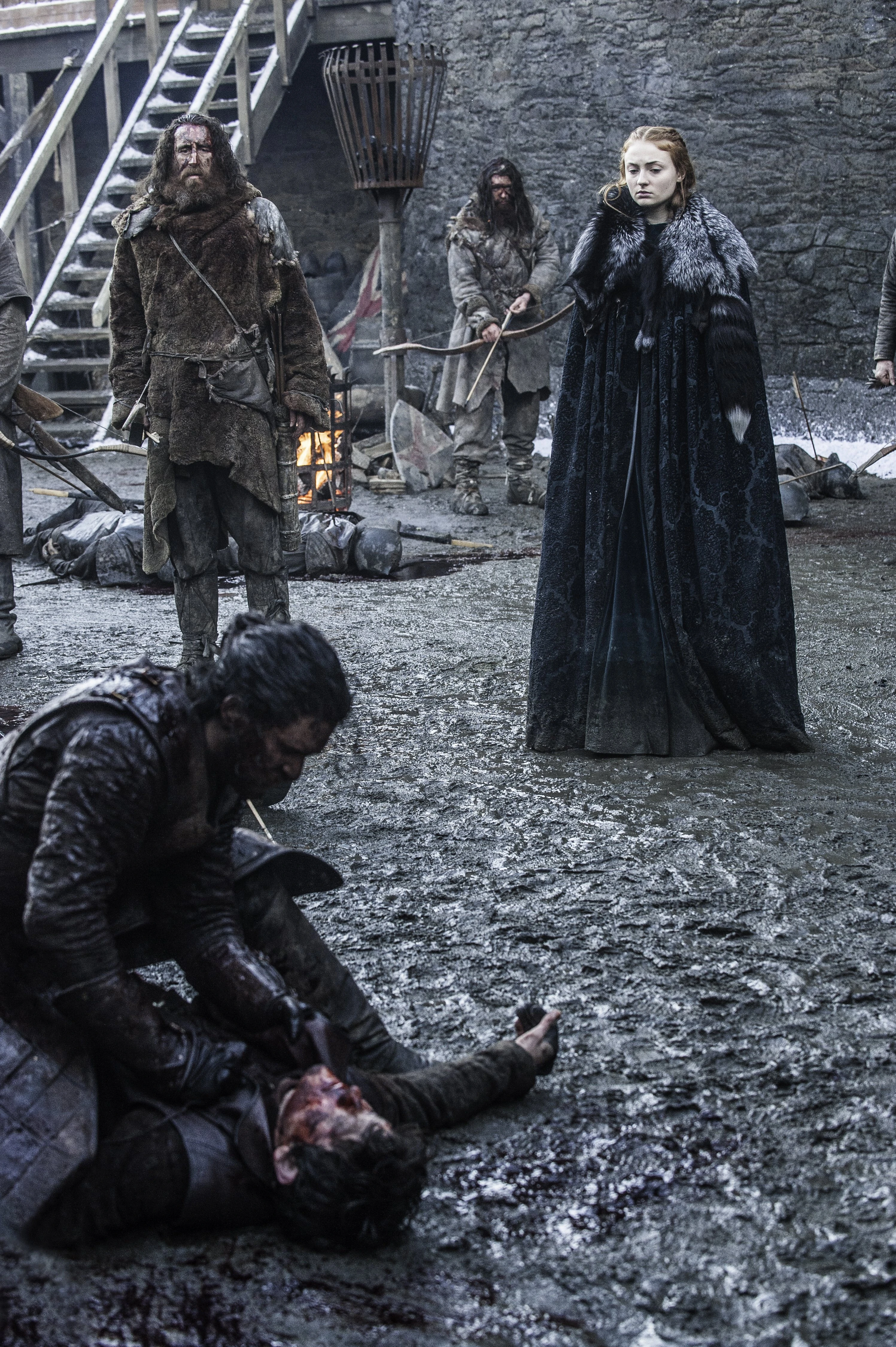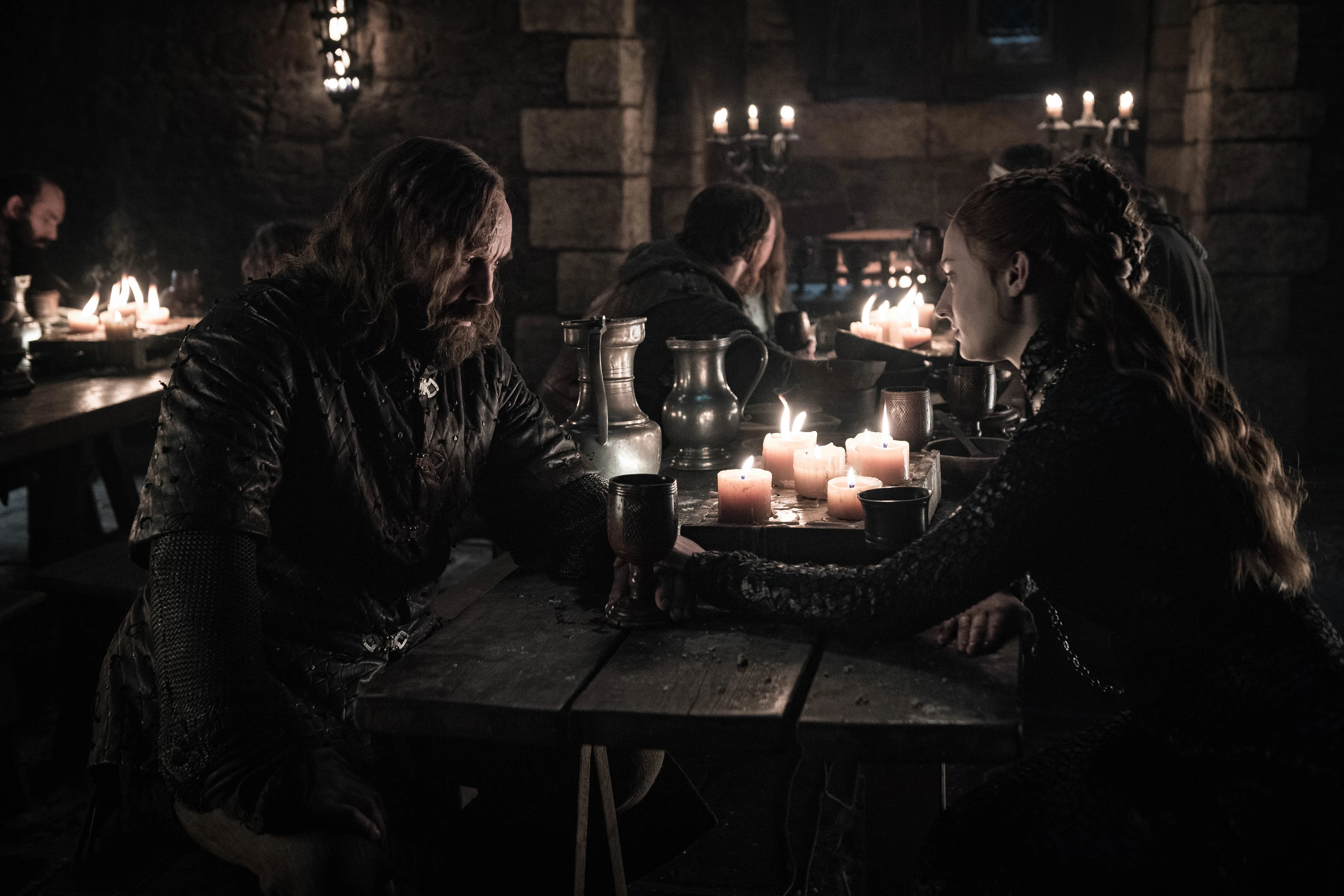The survivors of the battle later gather in front of Winterfell’s walls to light the funeral pyres of all who gave their lives in defense of the living. Sansa tearfully places a pin bearing the House Stark direwolf onto Theon’s body before lighting his pyre herself. During the celebration feast that follows, she makes her way to the table where the Hound is seated.