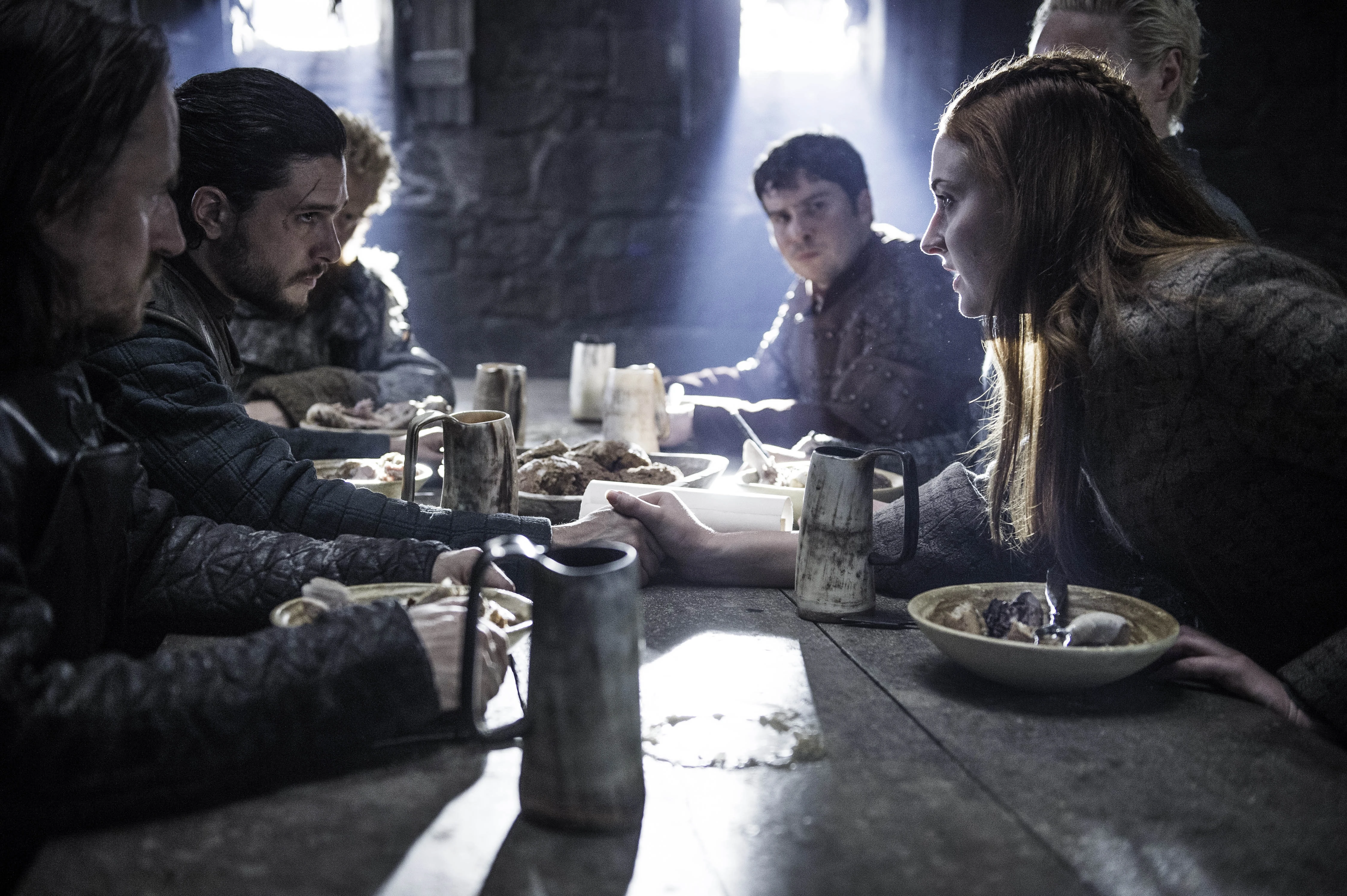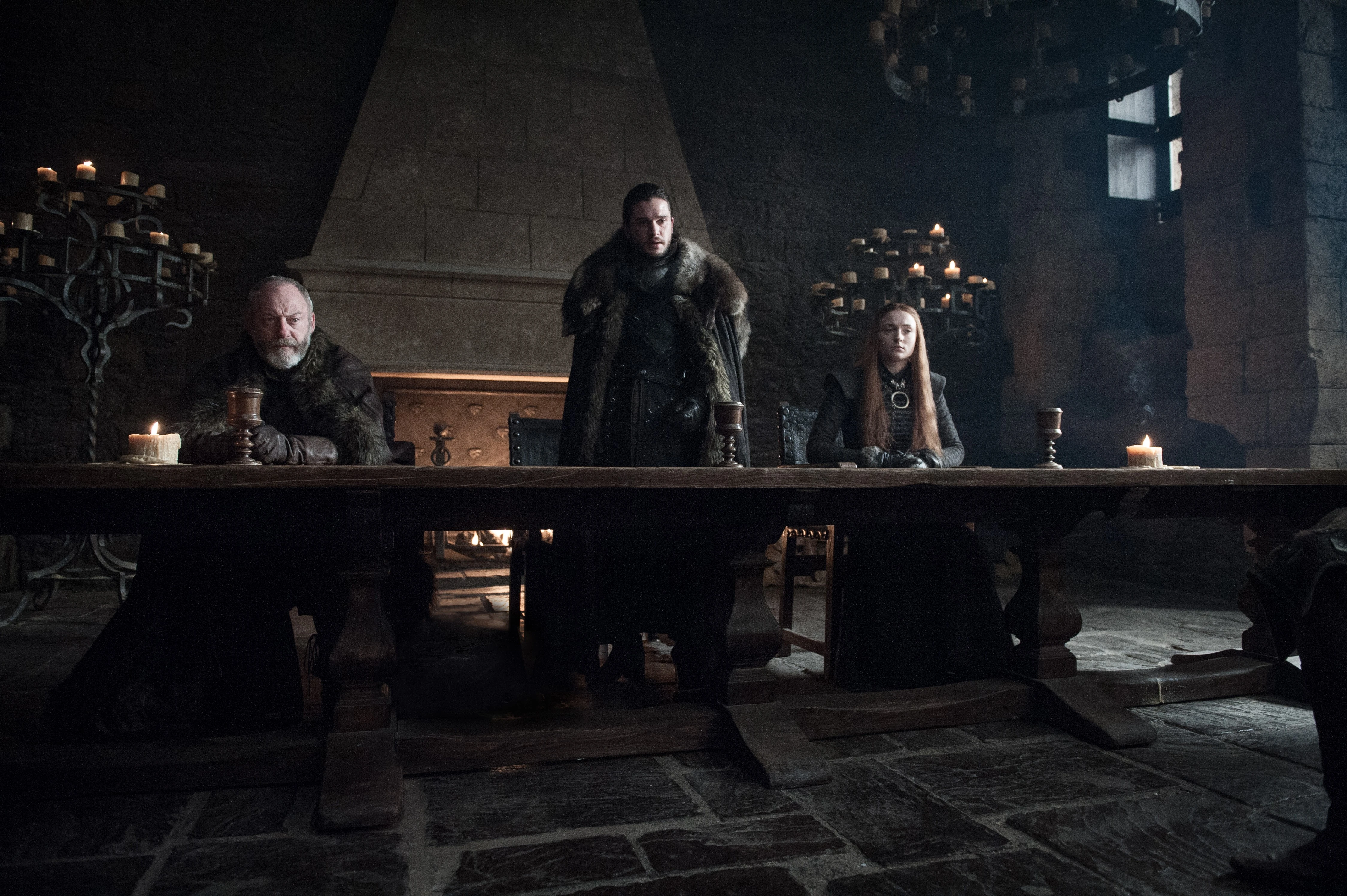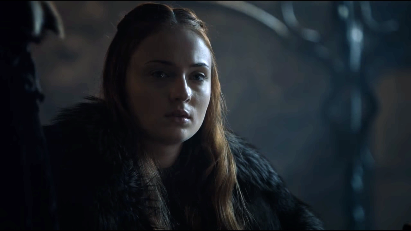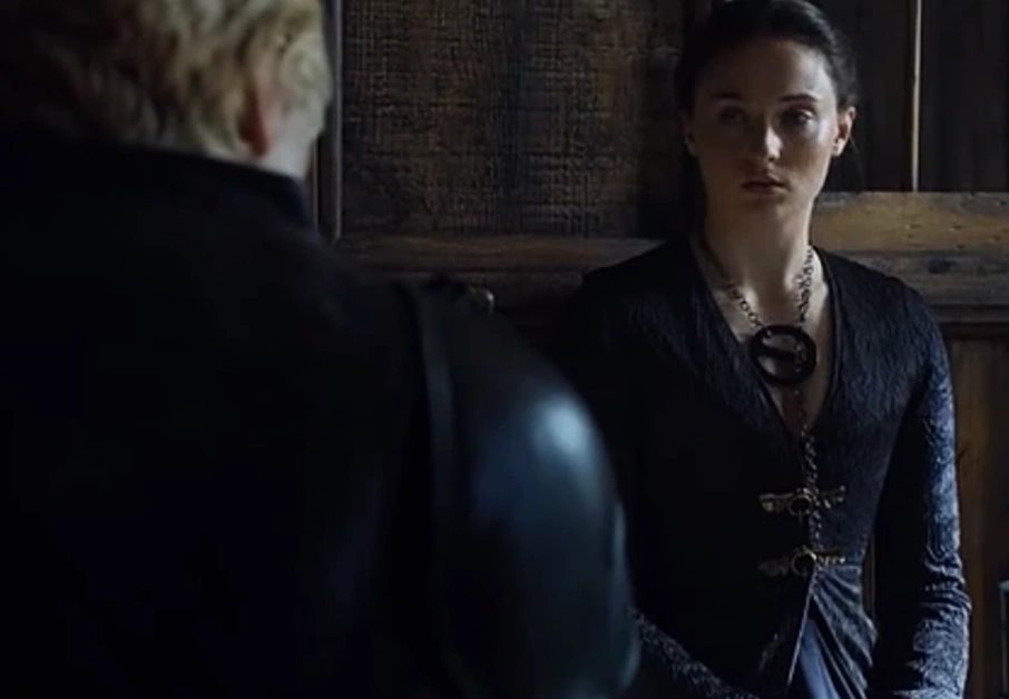 When Jaime Lannister arrives at Winterfell, Sansa – now clad in armor – is once again seated at the high table with Jon and Daenerys. The two women harshly berate the Kingslayer for his past actions and question whether his loyalty to their cause is genuine. Only when Brienne of Tarth vouches for Jaime does Sansa trust him, and Daenerys allows his sword to be returned to him.