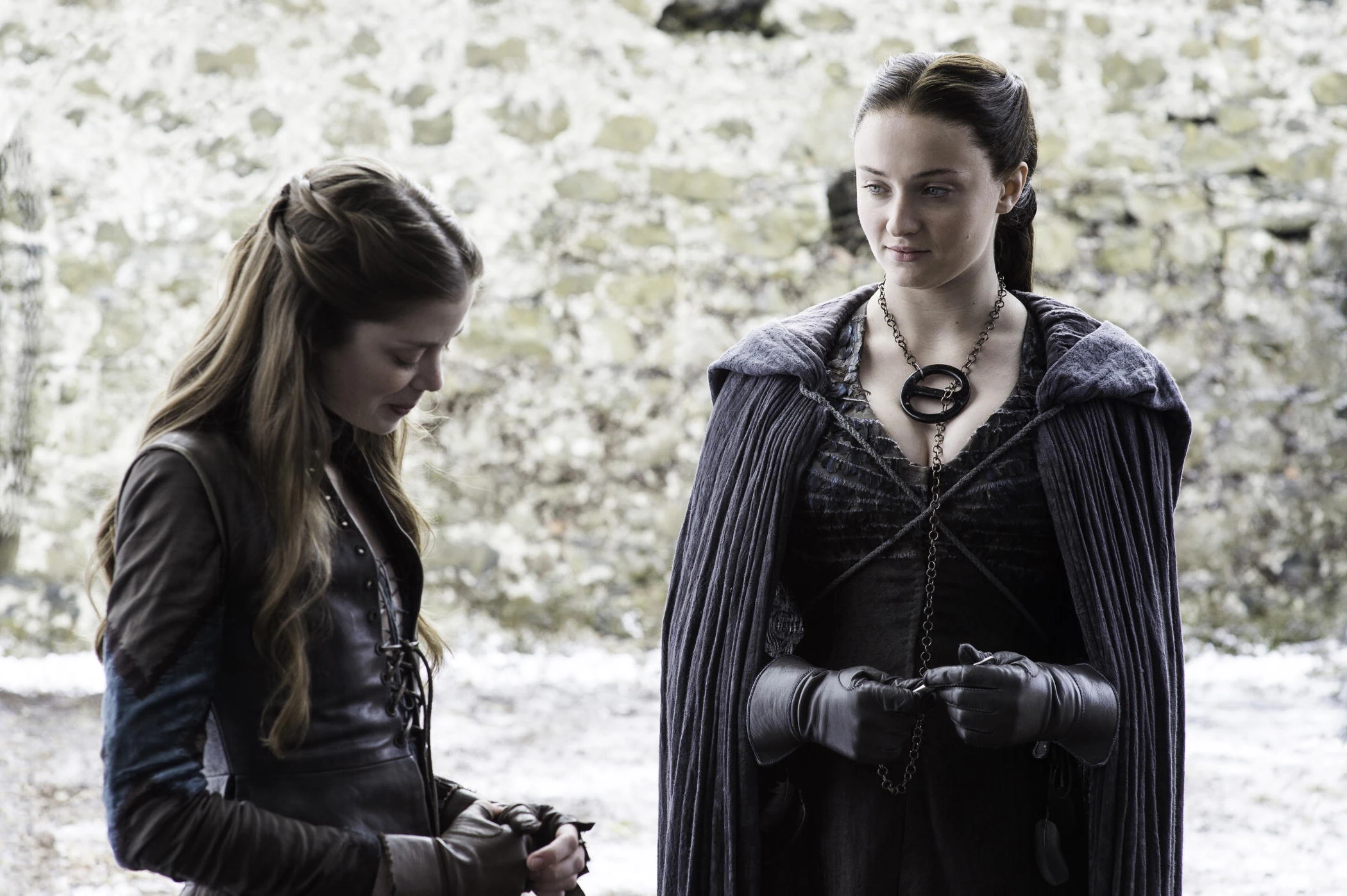 Sansa bids Jon farewell from the Winterfell battlements, wary of his alliance with Daenerys.