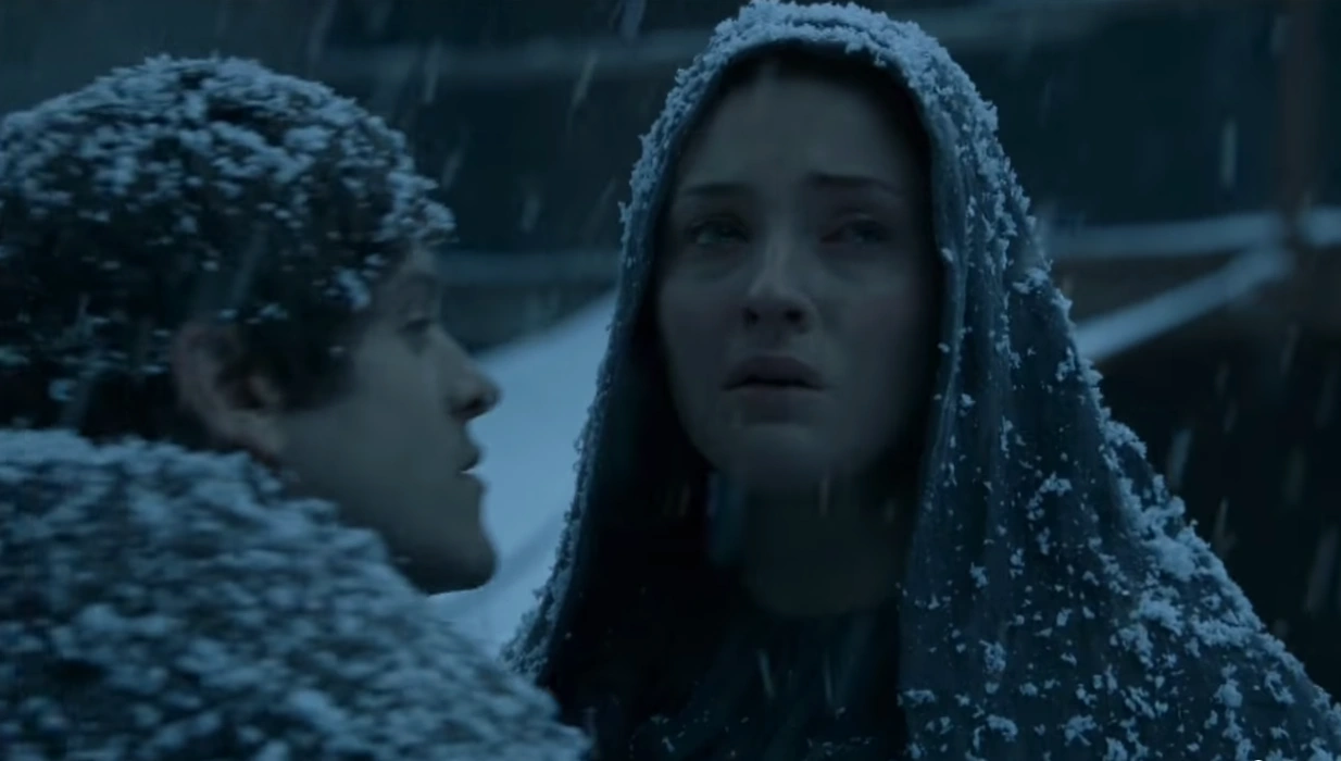 Later, Arya presents the letter that Sansa had written to their late brother Robb Stark urging him to come and bend the knee to King Joffrey Baratheon. Sansa replies that the Queen Mother Cersei Lannister forced her to do it under duress. Arya counters that she was not tortured and that she saw Sansa at Ned’s execution; Sansa retorts that Arya did nothing to stop their father’s execution either. Arya chastises Sansa for betraying their family but Sansa responds that they have only returned to Winterfell because of her, while Arya travelled the world in pursuit of her own agenda. Sansa adds that their half-brother Jon Snow was saved from defeat when Petyr Baelish and the Knights of the Vale came to their rescue and insists Arya would not have survived the torments she endured at the hands of Joffrey and Ramsay.